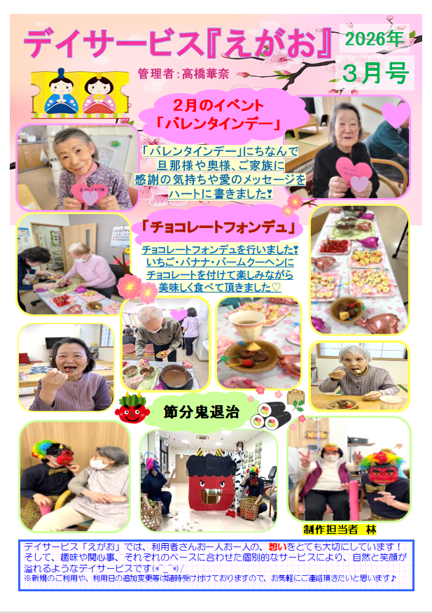 デイサービスセンター、デイサービスセンター「えがお」、ショートステイセンター、サービス付き高齢者向け住宅では、毎月様々なイベントやレクリエーションを行い、季節の行事を楽しみながら過ごしています。
